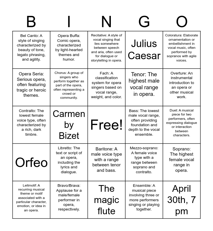 This bingo card has a free space and 24 words: Libretto: The text or script of an opera, including the lyrics and dialogue., Bravo/Brava: Applause for a male/female performer in opera, respectively., Fach: A classification system for opera singers based on vocal range, weight, and color., Leitmotif: A recurring musical theme or motif associated with a particular character, emotion, or idea in an opera., Coloratura: Elaborate ornamentation or embellishment in vocal music, often performed by sopranos with agile voices., Bel Canto: A style of singing characterized by beauty of tone, legato phrasing, and agility., Opera Seria: Serious opera, often featuring tragic or heroic themes., Opera Buffa: Comic opera, characterized by light-hearted themes and humor., Bass: The lowest male vocal range, often providing foundation and depth to the vocal ensemble., Baritone: A male voice type with a range between tenor and bass., Tenor: The highest male vocal range in opera., Contralto: The lowest female voice type, often characterized by a rich, dark timbre., Mezzo-soprano: A female voice type with a range between soprano and contralto., Soprano: The highest female vocal range in opera., Chorus: A group of singers who perform together as part of the opera, often representing a crowd or community., Ensemble: A musical piece involving three or more performers singing or playing together., Duet: A musical piece for two performers, often expressing dialogue or interaction between characters., Recitative: A style of vocal singing that lies somewhere between speech and aria, often used for dialogue or storytelling in opera., Overture: An instrumental introduction to an opera or other musical work., Carmen by Bizet, April 30th, 7 pm, Orfeo, Julius Caesar and The magic flute.