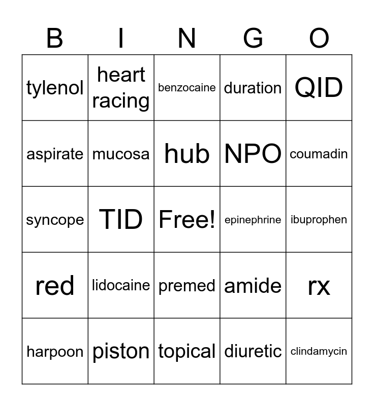 This bingo card has a free space and 24 words: lidocaine, piston, hub, harpoon, QID, tylenol, aspirate, heart racing, epinephrine, premed, NPO, syncope, amide, rx, mucosa, diuretic, ibuprophen, benzocaine, coumadin, TID, clindamycin, red, duration and topical.