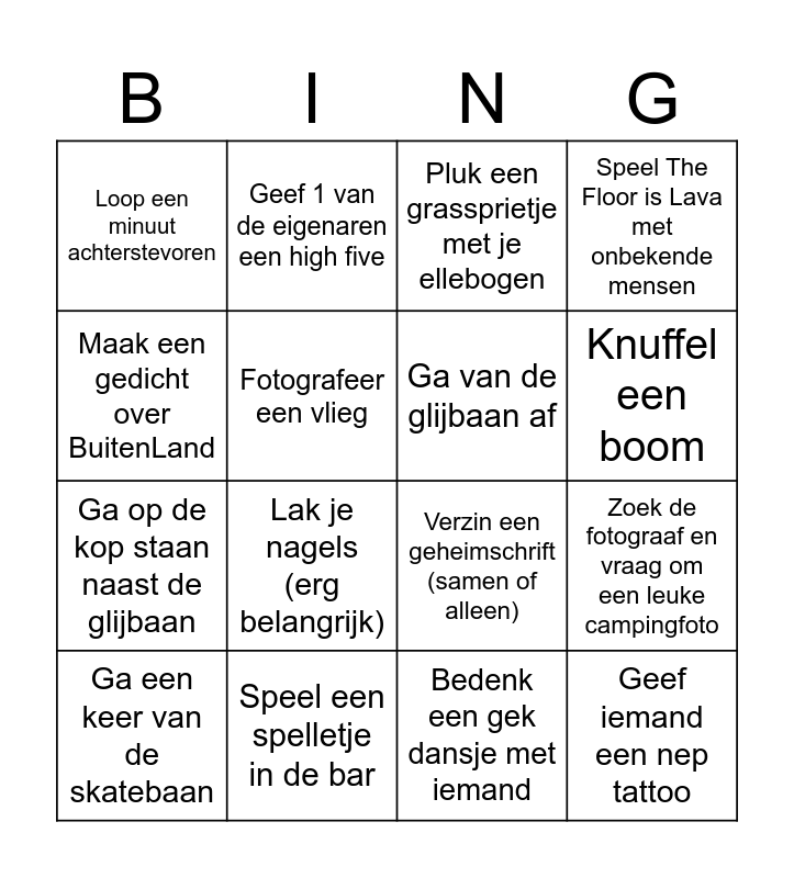 This bingo card has 52 words: Neem een duik in de Zandpol, Ga een keer van de skatebaan, Maak een leuke foto bij de poort bij de ingang, Zoek een veer, Ga op de schommel en spring er als je op je allerhoogst bent vanaf, Maak een spiegelselfie in het toiletgebouw, Geef 1 van de eigenaren een high five, Geef iemand die je niet kent een compliment, Fotografeer een vlieg, Maak een kunstwerk met dingen uit de natuur, Ga van de glijbaan af, Probeer een klein voorwerp te ruilen voor iets groots, Bedenk je eigen opdracht en laat iemand anders het uitvoeren, Loop met je blote voeten door het gras, Doe iets wat je thuis nooit zou doen, Slaap uit tot zo lang je wilt, Knuffel een boom, Speel een spelletje in de bar, Stel een vraag over iets wat je altijd al hebt willen weten, Maak een gedicht over BuitenLand, Zoek de fotograaf en vraag om een leuke campingfoto, Maak een selfie met een hond en het baasje, Loop een minuut achterstevoren, Ga op de kop staan naast de glijbaan, Poets de tanden voor iemand anders, Doe de afwas voor je buurman, Maak een koprol in het bos, Pluk een grasspriet met je tenen, Lak je nagels (erg belangrijk), Maak een foto van je favoriete plek op de camping, Doe een klusje voor de bar, Speel The Floor is Lava met onbekende mensen, Speel een bruiloft na, Maak een foto van een paarse bloem, Treed op als straatmuzikant, Pluk een grassprietje met je ellebogen, Wissel van shirt met iemand anders, Stay hydrated: drink een glas water, Rooster marshmallows bij het vuur, Doe de stoelendans, Doe alsof je een spion bent, Bedenk een gek dansje met iemand, Geef iemand een nep tattoo, Vraag een vreemde om een handtekening, Teken iemand zo goed mogelijk na, Maak een papieren vliegtuig, Beeld je grootste droom uit, Verzin een geheimschrift (samen of alleen), Kies een verboden woord en zeg die 3 uur lang niet meer, Noem 10 dingen die met de zelfde letter beginnen als jouw naam, Zing een zelfverzonnen liedje over BuitenLand and Ga een rondje over de camping en bedenk elke 5 minuten een andere manier van lopen (bijv; hinkelen, springen, etc.).