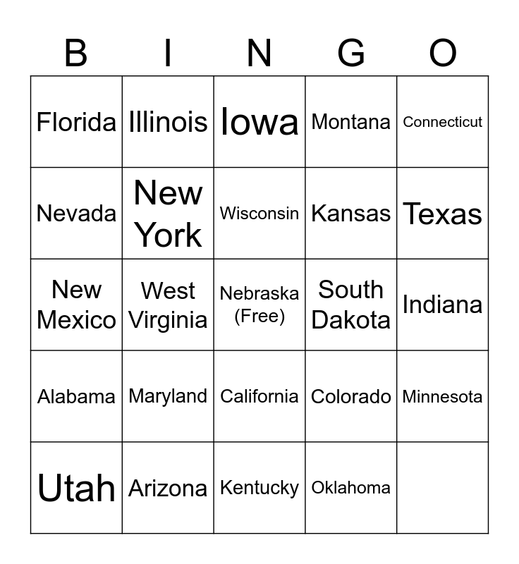 This bingo card has a free space and 24 words: Alabama, Arizona, California, Colorado, Connecticut, Florida, Illinois, Iowa, Kansas, Minnesota, Nevada, New York, North Dakota, South Dakota, Texas, Utah, West Virginia, Wisconsin, Montana, Indiana, New Mexico, Maryland, Kentucky and Oklahoma.
