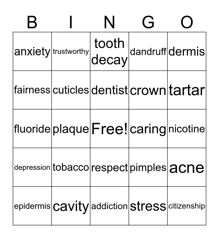 This bingo card has a free space and 24 words: tobacco, cavity, dentist, epidermis, dermis, anxiety, fairness, trustworthy, caring, respect, crown, fluoride, pimples, acne, cuticles, stress, nicotine, tooth decay, tartar, plaque, citizenship, depression, dandruff and addiction.