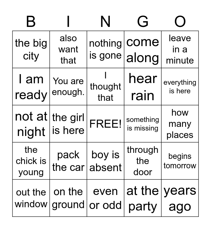 This bingo card has a free space and 24 words: pack the car, on the ground, I thought that, out the window, leave in a minute, the big city, I am ready, also want that, something is missing, boy is absent, hear rain, not at night, through the door, begins tomorrow, You are enough., at the party, how many places, nothing is gone, everything is here, the girl is here, years ago, the chick is young, come along and even or odd.