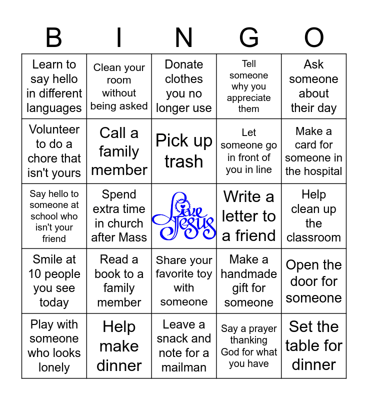 This bingo card has a free space and 32 words: Say a prayer thanking God for what you have, Pray for those who don't have what they need, Spend extra time in church after Mass, Write a note to someone you care about, Smile at 10 people you see today, Call a family member, Ask someone about their day, Open the door for someone, Clean your room without being asked, Help do the dishes after dinner, Pick up trash, Donate clothes you no longer use, Donate toys you no longer use, Write a letter to your teacher, Write a letter to a friend, Give someone a hug, Play with someone who looks lonely, Say hello to someone at school who isn't your friend, Share your favorite toy with someone, Read a book to a family member, Make a handmade gift for someone, Tell everyone in your family that you love them, Help clean up the classroom, Help make dinner, Set the table for dinner, Tell someone why you appreciate them, Let someone go in front of you in line, Volunteer to do a chore that isn't yours, Learn to say hello in different languages, Leave a snack and note for a mailman, Write a note to a service worker in your community and Make a card for someone in the hospital.
