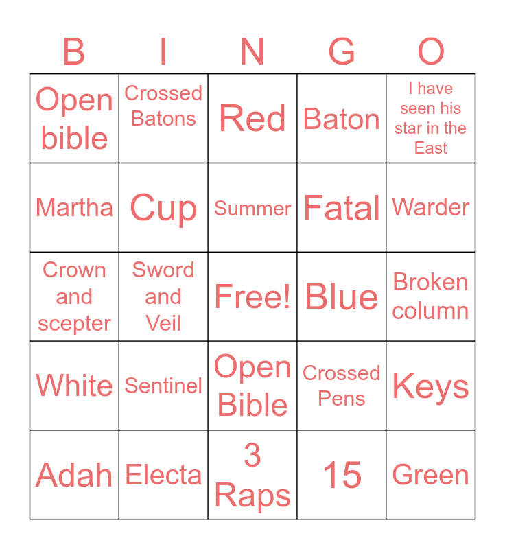 This bingo card has a free space and 29 words: Adah, Yellow, Sword and Veil, Ruth, Open bible, Red, Cup, Sentinel, Blue, Electa, Broken column, Green, 3 Raps, 15, Warder, Esther, Open Bible, White, I have seen his star in the East, Crown and scepter, Crossed Pens, 3 motions, Fatal, Martha, Baton, Crossed Batons, Keys, Summer and Winter.