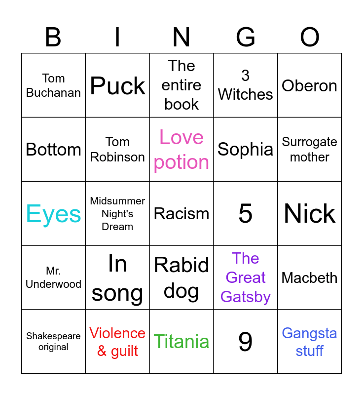 This bingo card has 35 words: Green Light, Mockingbird, Hands are red, Tom Robinson, Rabid dog, 3 Witches, Bottom, Demetrius, Love potion, Duncan, Eyes, Oberon, Free!, Atticus, Tom Buchanan, 5, 9, Midsummer Night's Dream, Mr. Underwood, Racism, The Great Gatsby, Shakespeare original, Macbeth, Violence & guilt, The entire book, Surrogate mother, Gangsta stuff, Alcohol, Sophia, Nick, Truman Show, Titania, In song, Puck and Susan.