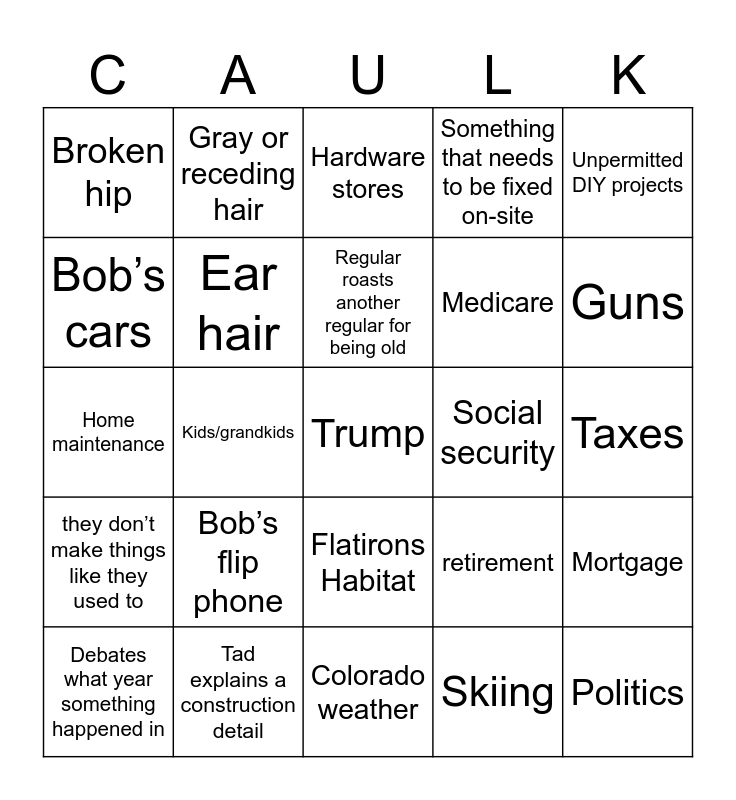 This bingo card has 25 words: Bob’s flip phone, Colorado weather, Regular roasts another regular for being old, Debates what year something happened in, Unpermitted DIY projects, Broken hip, Bob’s cars, Gray or receding hair, Social security, Flatirons Habitat, Medicare, Home maintenance, retirement, Mortgage, Ear hair, Politics, Taxes, Hardware stores, Guns, Kids/grandkids, Trump, Tad explains a construction detail, they don’t make things like they used to, Something that needs to be fixed on-site and Skiing.
