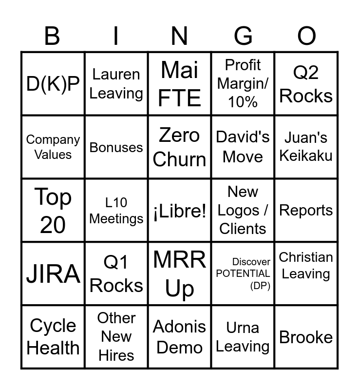 This bingo card has a free space and 24 words: Q1 Rocks, Other New Hires, Zero Churn, Cycle Health, Q2 Rocks, D(K)P, Company Values, Lauren Leaving, New Logos / Clients, MRR Up, David's Move, Top 20, Discover POTENTIAL (DP), Christian Leaving, Bonuses, Urna Leaving, Reports, Mai FTE, Juan's Keikaku, L10 Meetings, Brooke, JIRA, Profit Margin/ 10% and Adonis Demo.