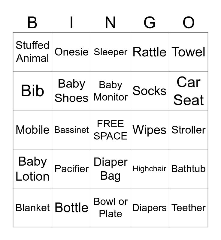 This bingo card has a free space and 24 words: Pacifier, Bottle, Baby Monitor, Blanket, Towel, Stuffed Animal, Bib, Onesie, Wipes, Diaper Bag, Socks, Mobile, Highchair, Bathtub, Baby Shoes, Diapers, Stroller, Sleeper, Car Seat, Bassinet, Teether, Baby Lotion, Rattle and Bowl or Plate.