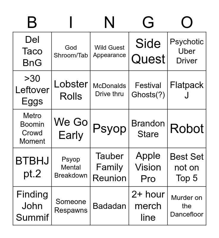 This bingo card has a free space and 24 words: Psyop Mental Breakdown, Someone Respawns, McDonalds Drive thru, Finding John Summif, Psychotic Uber Driver, Del Taco BnG, >30 Leftover Eggs, God Shroom/Tab, Brandon Stare, Tauber Family Reunion, Festival Ghosts(?), Metro Boomin Crowd Moment, Apple Vision Pro, Best Set not on Top 5, Lobster Rolls, 2+ hour merch line, Robot, Wild Guest Appearance, Flatpack J, We Go Early, Murder on the Dancefloor, BTBHJ pt.2, Side Quest and Badadan.