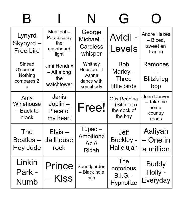 This bingo card has a free space and 40 words: Nirvana – Smells like teen spirit, Amy Winehouse – Back to black, David Bowie – Starman, Jimi Hendrix – All along the watchtower, Prince – Kiss, Tupac – Ambitionz Az A Ridah, Whitney Houston – I wanna dance with somebody, Michael Jackson – Billie Jean, Andre Hazes – Bloed, zweet en tranen, The Beatles – Hey Jude, Janis Joplin – Piece of my heart, Avicii - Levels, Buddy Holly - Everyday, John Denver – Take me home, country roads, Otis Redding – (Sittin’ on) the dock of the bay, Elvis – Jailhouse rock, Queen – Don’t stop me now, Lynyrd Skynyrd – Free bird, Marvin Gaye – Ain’t no mountain high enough, George Michael – Careless whisper, Aaliyah – One in a million, The notorious B.I.G. - Hypnotize, Bob Marley – Three little birds, Sinead O’connor – Nothing compares 2 u, Tina Turner – The best, The Cranberries - Zombie, Frank Sinatra – Fly me to the moon, Olivia Newton John - Physical, XXXtentacion – SAD!, Fleetwood Mac (Christine McVie) - Everywhere, Mac Miller – Self care, Linkin Park - Numb, The Doors – Light my fire, Jeff Buckley - Hallelujah, Ramones – Blitzkrieg bop, Soundgarden – Black hole sun, JuiceWRLD – Lucid dreams, Marilyn Monroe – I wanna be loved by you, Meatloaf – Paradise by the dashboard light and Joy Division – Love will tear us apart.