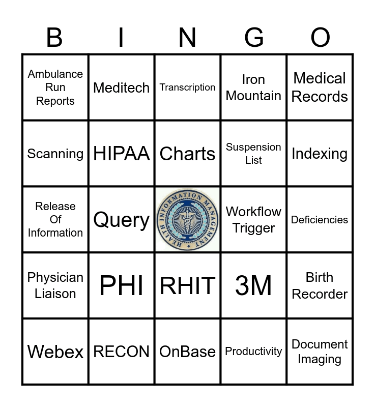 This bingo card has a free space and 24 words: PHI, RECON, Charts, Webex, Medical Records, Ambulance Run Reports, Scanning, Meditech, Workflow Trigger, RHIT, Suspension List, Release Of Information, 3M, Birth Recorder, HIPAA, Productivity, Deficiencies, Transcription, Indexing, Query, Document Imaging, Physician Liaison, Iron Mountain and OnBase.
