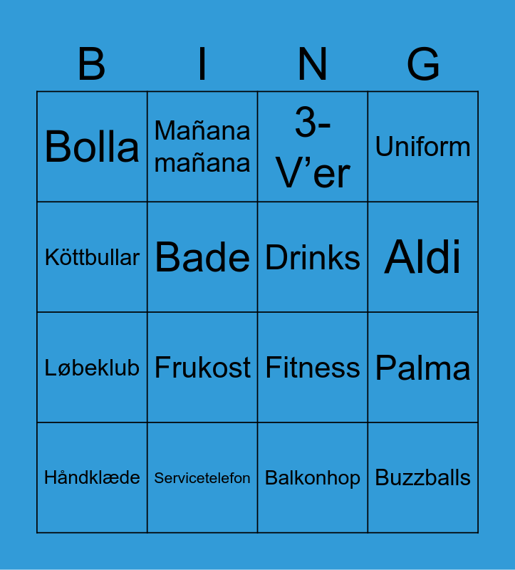 This bingo card has 56 words: Free!, Roligt, Allihopa, Bolla, Sol, Dans, Drinks, Peppes, Løbeklub, Fitten, Uniform, Pjattet med patter, Klunka, Utopiadans, Remember, Venner/komposition, Köttbullar, Palma, Hotel, Håndklæde, Servicetelefon, Nødtelefon, HVIS, 3-V’er, Spar, Aldi, Strand M, Strand P, Frukost, Eilif Krogager, TUI, Apollo, Pigg, Mössa, Balkonhop, Bade, Fitness, Hotelservice, Buzzballs, Mañana mañana, Siesta, WOW-fitness, Lækker truss, Dagens guide, Søren, Hjalmer, 69, 90, 88, 133, 13, 11, Sangria, Yapper, Come on now dawg and Una Cervaza Por favor.
