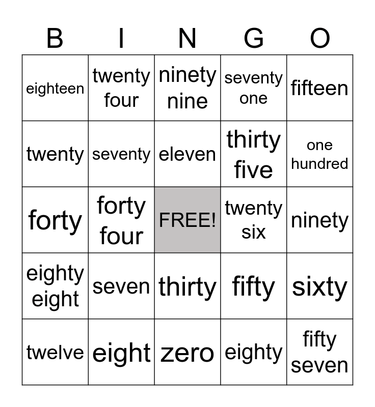 This bingo card has a free space and 24 words: seven, eight, eleven, twelve, fifteen, eighteen, twenty, twenty four, twenty six, thirty, thirty five, forty, fifty, sixty, seventy, eighty, ninety, ninety nine, one hundred, forty four, fifty seven, eighty eight, seventy one and zero.