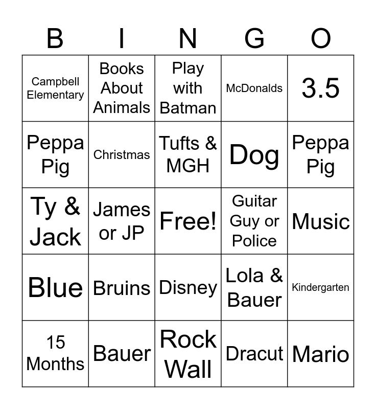 This bingo card has a free space and 24 words: Bruins, Bauer, Tufts & MGH, 15 Months, 3.5, Campbell Elementary, Peppa Pig, Books About Animals, Guitar Guy or Police, Disney, Dog, Ty & Jack, Lola & Bauer, Kindergarten, Christmas, Dracut, Music, Play with Batman, Peppa Pig, James or JP, Mario, Blue, McDonalds and Rock Wall.
