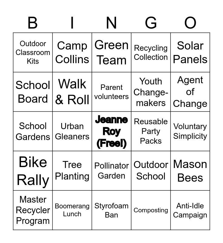 This bingo card has a free space and 29 words: Master Recycler Program, Climate Policy, Urban Gleaners, Clean Up Kits, Outdoor Classroom Kits, Green Team, Walk & Roll, Tree Planting, Reusable Party Packs, Boomerang Lunch, Voluntary Simplicity, Anti-Idle Campaign, Styrofoam Ban, Composting, Agent of Change, Food Waste Prevention, Pollinator Garden, Bike Rally, Solar Panels, School Gardens, Outdoor School, Water bottle filling stations, Youth Change-makers, School Board, Recycling Collection, Camp Collins, Mason Bees, Parent volunteers and Metal Utensils.