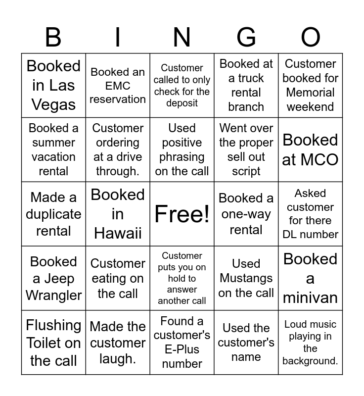 This bingo card has a free space and 24 words: Flushing Toilet on the call, Customer eating on the call, Used positive phrasing on the call, Used the customer's name, Customer booked for Memorial weekend, Booked in Las Vegas, Booked an EMC reservation, Customer called to only check for the deposit, Booked a one-way rental, Asked customer for there DL number, Made a duplicate rental, Customer ordering at a drive through., Used Mustangs on the call, Booked a minivan, Booked a summer vacation rental, Made the customer laugh., Found a customer's E-Plus number, Booked at a truck rental branch, Booked at MCO, Booked a Jeep Wrangler, Booked in Hawaii, Customer puts you on hold to answer another call, Went over the proper sell out script and Loud music playing in the background..