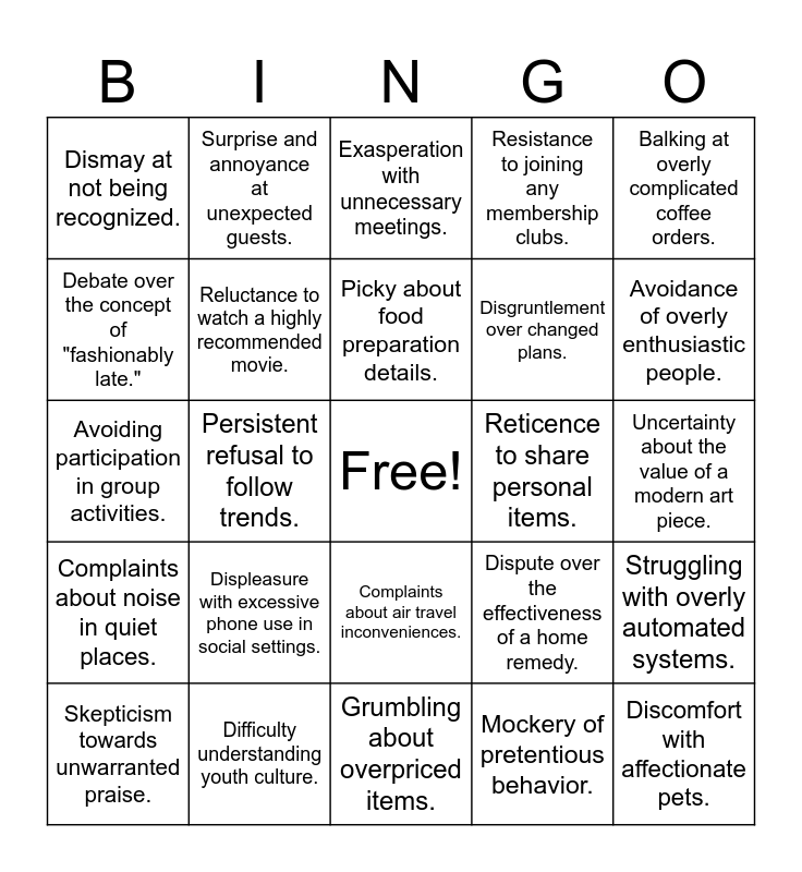 This bingo card has a free space and 25 words: Displeasure with excessive phone use in social settings., Grumbling about overpriced items., Picky about food preparation details., Skepticism towards unwarranted praise., Balking at overly complicated coffee orders., Dismay at not being recognized., Debate over the concept of "fashionably late.", Surprise and annoyance at unexpected guests., Reticence to share personal items., Complaints about air travel inconveniences., Disgruntlement over changed plans., Avoiding participation in group activities., Dispute over the effectiveness of a home remedy., Struggling with overly automated systems., Reluctance to watch a highly recommended movie., Questioning the need for certain social media posts., Uncertainty about the value of a modern art piece., Exasperation with unnecessary meetings., Avoidance of overly enthusiastic people., Persistent refusal to follow trends., Discomfort with affectionate pets., Difficulty understanding youth culture., Complaints about noise in quiet places., Resistance to joining any membership clubs. and Mockery of pretentious behavior..