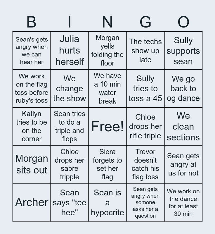 This bingo card has a free space and 24 words: Chloe drops her sabre tripple, Sean says "tee hee", We have a 10 min water break, Archer, Sully supports sean, Sean's gets angry when we can hear her, We work on the flag toss before ruby's toss, Julia hurts herself, Chloe drops her rifle triple, Siera forgets to set her flag, Sully tries to toss a 45, Katlyn tries to be on the corner, Trevor doesn't catch his flag toss, Sean gets angry at us for not, We change the show, Sean gets angry when somone asks her a question, We clean sections, Morgan yells folding the floor, We go back to og dance, Sean tries to do a triple and flops, We work on the dance for at least 30 min, Morgan sits out, The techs show up late and Sean is a hypocrite.