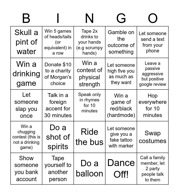 This bingo card has 25 words: Do a shot of spirits, Do a balloon, Win a contest of physical strength, Show someone you bank account, Let someone send a text from your phone, Skull a pint of water, Win a drinking game, Win 5 games of heads/tails (or equivalent) in a row, Win a game of red/black (hardmode), Ride the bus, Let someone high five you as much as they want, Let someone slap you once, Let someone give you a fake tattoo with marker, Swap costumes, Donate $10 to a charity of Morgan's choice, Call a family member, let 2 party people talk to them, Hop everywhere for 10 minutes, Tape 2x drinks to your hands (e.g scrumpy hands), Leave a passive aggressive but positive google review, Talk in a foreign accent for 30 minutes, Speak only in rhymes for 10 minutes, Tape yourself to another person, Win a chugging contest (this is not a drinking game), Gamble on the outcome of something and Dance Off!.