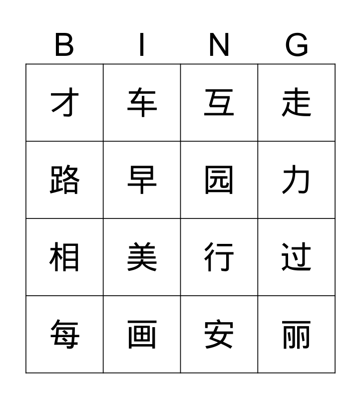 This bingo card has 16 words: 画, 过, 互, 才, 相, 车, 行, 安, 路, 早, 每, 走, 美, 力, 园 and 丽.