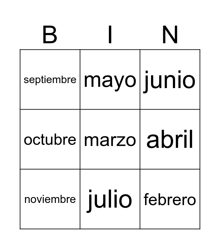 This bingo card has 12 words: enero, febrero, marzo, abril, mayo, junio, julio, agosto, septiembre, octubre, noviembre and diciembre.
