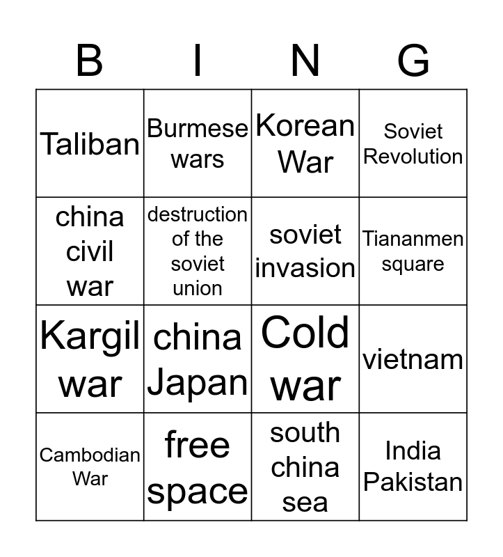 This bingo card has a free space and 15 words: Cambodian War, India Pakistan, Korean War, Taliban, Tiananmen square, china civil war, china Japan, south china sea, destruction of the soviet union, Kargil war, vietnam, Soviet Revolution, soviet invasion, Burmese wars and free space.