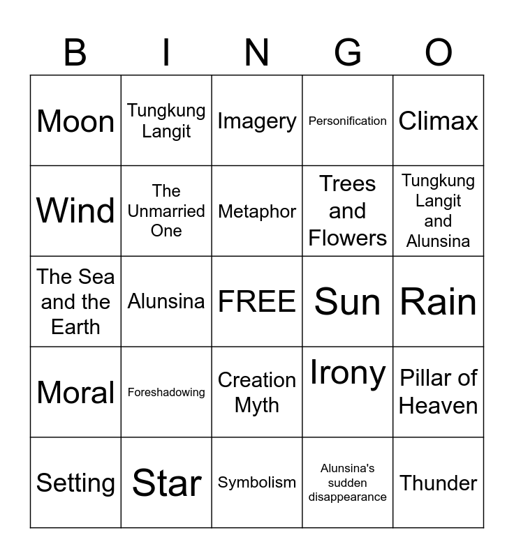 This bingo card has a free space and 24 words: Foreshadowing, Star, Metaphor, Setting, Climax, Moon, Wind, Tungkung Langit, Sun, Creation Myth, Trees and Flowers, The Sea and the Earth, Irony, Pillar of Heaven, The Unmarried One, Alunsina's sudden disappearance, Rain, Imagery, Tungkung Langit and Alunsina, Alunsina, Thunder, Moral, Personification and Symbolism.