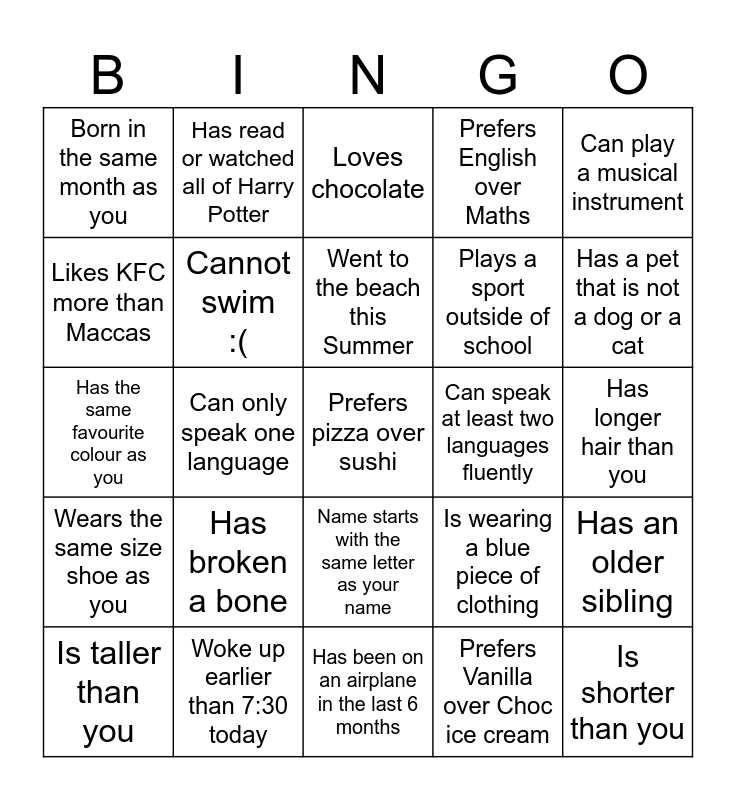 This bingo card has 25 words: Has broken a bone, Has been on an airplane in the last 6 months, Went to the beach this Summer, Is taller than you, Can play a musical instrument, Born in the same month as you, Likes KFC more than Maccas, Has read or watched all of Harry Potter, Can speak at least two languages fluently, Name starts with the same letter as your name, Plays a sport outside of school, Has the same favourite colour as you, Is wearing a blue piece of clothing, Has an older sibling, Cannot swim :(, Is shorter than you, Has longer hair than you, Loves chocolate, Has a pet that is not a dog or a cat, Can only speak one language, Prefers pizza over sushi, Woke up earlier than 7:30 today, Wears the same size shoe as you, Prefers English over Maths and Prefers Vanilla over Choc ice cream.