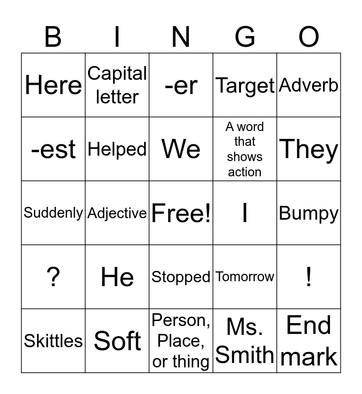 This bingo card has a free space and 24 words: He, Soft, We, Skittles, Adverb, Here, -est, Capital letter, I, Stopped, A word that shows action, Suddenly, Tomorrow, !, Helped, Ms. Smith, Bumpy, -er, They, Adjective, End mark, ?, Target and Person, Place, or thing.