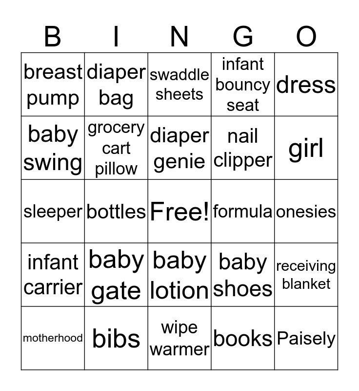 This bingo card has a free space and 65 words: baby wipes, baby oinment, high chair, receiving blanket, quilt, bathtub, diaper bag, diapers, diaper genie, baby shampoo, baby lotion, rubber duck, onesies, dress, car seat, baby swing, bottles, breast pump, monitor, nail clipper, baby gate, infant carrier, infant bouncy seat, crib mobile, crib sheets, stuffed animal, changing table, owl, Paisely, burp cloths, motherhood, toys, pacifier, booties, baby shoes, bibs, baby pillow, sleeper, books, nursing pillow, grocery cart pillow, baby dishes, formula, teething ring, rattle, Pink, girl, daughter, shower, hospital nightgown, Stroller, blanket, coat, wipe warmer, bottle warmer, crib mattress pad, crib liner, swaddle sheets, picture frame, baby gym, grooming kit, car safety mirror, thermometer, wearable carrier and nursey caddie.
