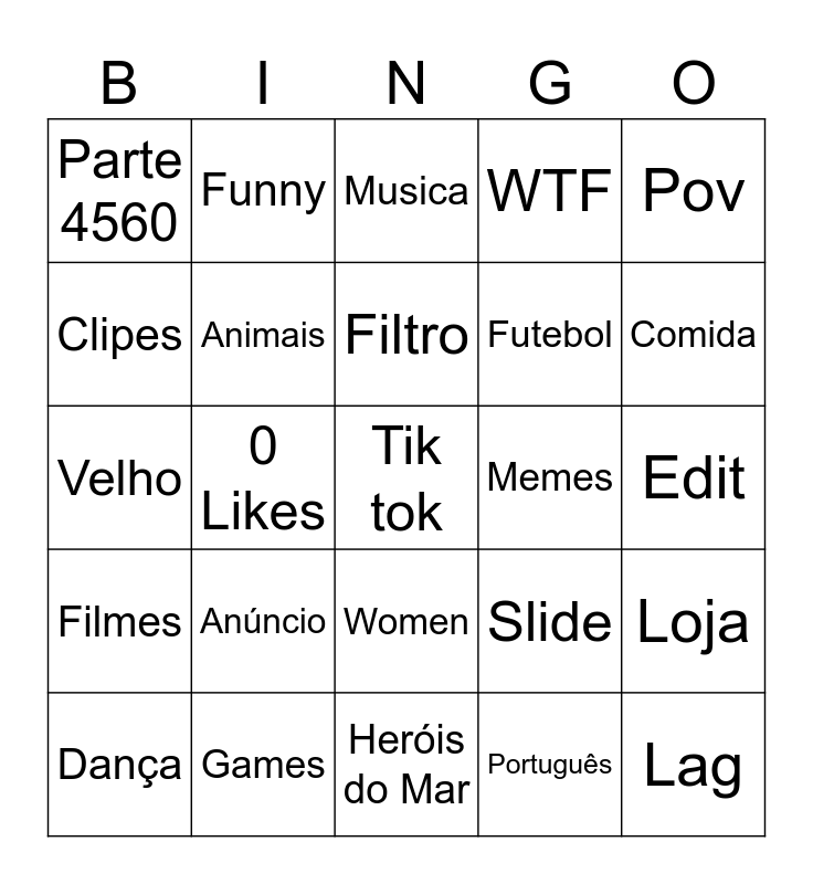 This bingo card has a free space and 24 words: Anúncio, Games, Filtro, Dança, Pov, Parte 4560, Clipes, Funny, Memes, Women, Futebol, Velho, Slide, Loja, Animais, Português, Edit, Musica, Comida, 0 Likes, Lag, Filmes, WTF and Heróis do Mar.
