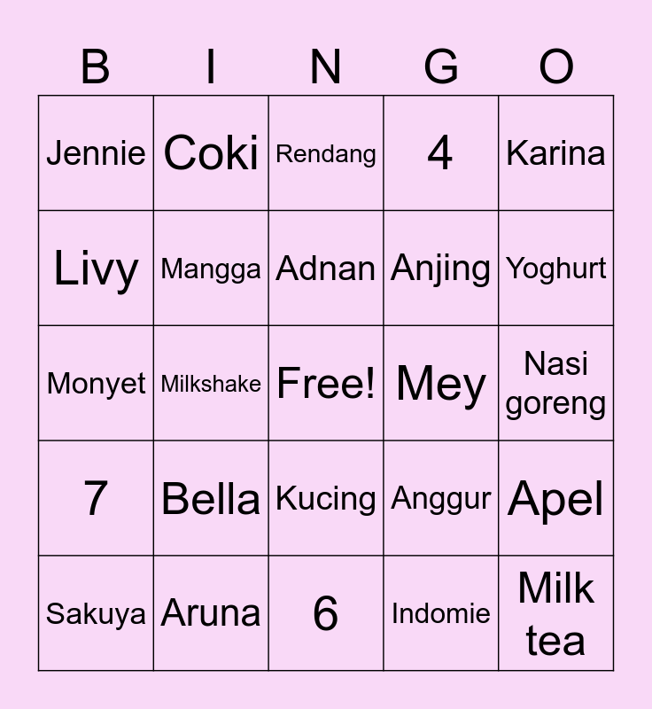 This bingo card has a free space and 24 words: Bella, Aruna, Adnan, Sakuya, Karina, Jennie, Livy, Coki, Mey, Kucing, Anjing, Monyet, Anggur, Apel, Mangga, Indomie, Nasi goreng, Rendang, Yoghurt, Milkshake, Milk tea, 7, 4 and 6.