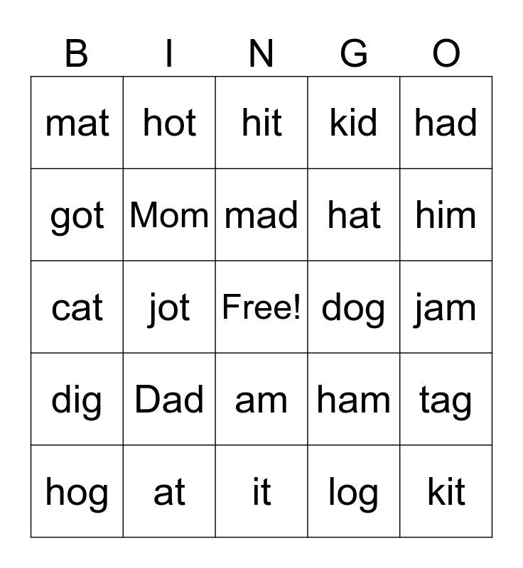 This bingo card has a free space and 24 words: Dad, at, mad, hog, had, mat, got, hot, dog, am, hat, cat, ham, tag, Mom, log, jam, hit, him, jot, kit, dig, kid and it.