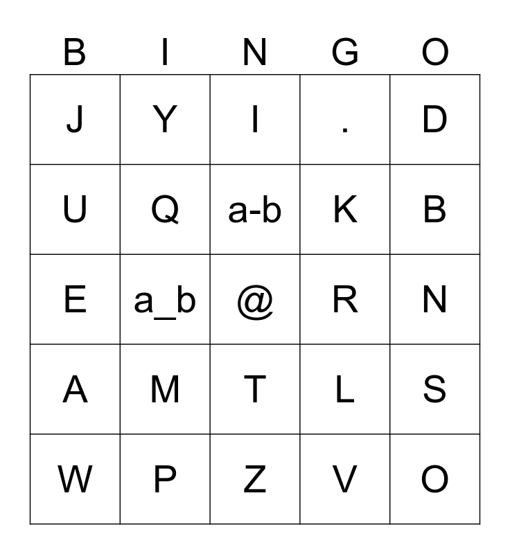 This bingo card has a free space and 24 words: M, P, a-b, W, D, J, U, Y, R, T, K, E, L, S, Q, V, N, I, B, a_b, O, A, . and Z.
