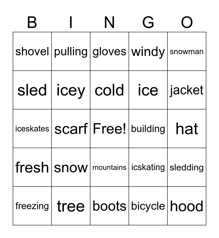 This bingo card has a free space and 24 words: snow, tree, cold, freezing, snowman, shovel, sled, pulling, building, mountains, ice, iceskates, icskating, sledding, icey, bicycle, hat, gloves, jacket, scarf, hood, fresh, windy and boots.