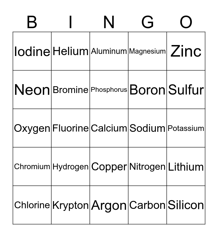 This bingo card has 25 words: Hydrogen, Argon, Phosphorus, Chlorine, Zinc, Iodine, Neon, Helium, Sodium, Copper, Boron, Oxygen, Nitrogen, Lithium, Bromine, Silicon, Potassium, Aluminum, Sulfur, Fluorine, Calcium, Krypton, Chromium, Magnesium and Carbon.
