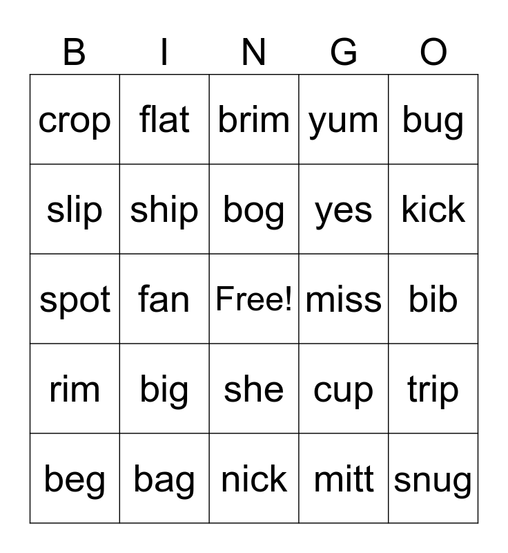 This bingo card has a free space and 24 words: big, bag, bog, beg, bug, crop, slip, flat, miss, she, yes, spot, cup, trip, ship, mitt, bib, brim, kick, fan, snug, rim, yum and nick.