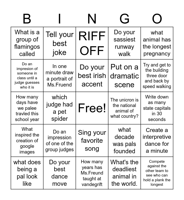 This bingo card has a free space and 24 words: Do an impression of one of the group judges, Do your best dance move, Do your best irish accent, what does being a pal look like, what animal has the longest pregnancy, What is a group of flamingos called, Do an impresion of someone in class until a judge guesses who it is, Tell your best joke, The unicron is the national animal of what country?, Sing your favorite song, Put on a dramatic scene, How many days have we palee travled this school year, what decade was pals founded, Create a interpretive dance for a minute, In one minute draw a portrait of Ms.Fruend, What's the deadliest animal in the world., Write down as many state capitals in 30 seconds, RIFF OFF, Try and get to the building three door and back by speed walking, which judge had a pet spider, Compete against the other team to see who can hold a plank the longest, What inspired the creation of google images, Do your sassiest runway walk and How many years has Ms.Freund taught at vandegrift.