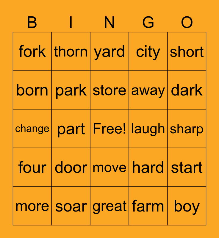 This bingo card has a free space and 24 words: door, soar, store, more, short, fork, born, thorn, laugh, move, away, change, hard, start, park, farm, sharp, yard, dark, part, boy, four, city and great.