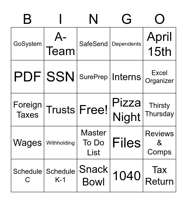 This bingo card has a free space and 34 words: Labenz, 1040, PTET, PTC, Wages, SSN, April 15th, Schedule C, A-Team, 1099s, SurePrep, SafeSend, CSOW, Extension, Pizza Night, Excel Organizer, Schedule K-1, Foreign Taxes, Withholding, Files, Master To Do List, Microsoft Teams, GoSystem, Thirsty Thursday, Snack Bowl, Tax Return, Dependents, IRA, Interns, PDF, March 15th, Trusts, Reviews & Comps and Itemized Deductions.
