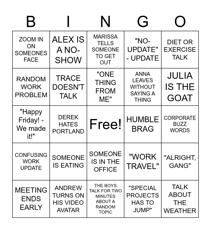 This bingo card has a free space and 24 words: SOMEONE IS EATING, ANDREW TURNS ON HIS VIDEO AVATAR, "ONE THING FROM ME", MEETING ENDS EARLY, DIET OR EXERCISE TALK, ZOOM IN ON SOMEONES FACE, RANDOM WORK PROBLEM, ALEX IS A NO-SHOW, HUMBLE BRAG, SOMEONE IS IN THE OFFICE, ANNA LEAVES WITHOUT SAYING A THING, "Happy Friday! - We made it!", "WORK TRAVEL", "ALRIGHT, GANG", TRACE DOESN'T TALK, "SPECIAL PROJECTS HAS TO JUMP", CORPORATE BUZZ WORDS, MARISSA TELLS SOMEONE TO GET OUT, JULIA IS THE GOAT, DEREK HATES PORTLAND, TALK ABOUT THE WEATHER, CONFUSING WORK UPDATE, "NO-UPDATE" - UPDATE and THE BOYS TALK FOR TWO MINUTES ABOUT A RANDOM TOPIC.