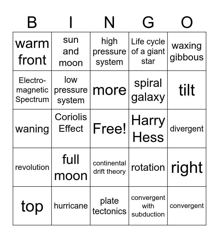This bingo card has a free space and 30 words: hurricane, weakens, Coriolis Effect, cold front, warm front, high pressure system, low pressure system, continental drift theory, Harry Hess, plate tectonics, divergent, convergent, convergent with subduction, transform, tilt, opposite, rotation, revolution, full moon, waxing gibbous, waning, tides, sun and moon, spiral galaxy, Electro-magnetic Spectrum, Life cycle of a giant star, right, top, more and the sun.