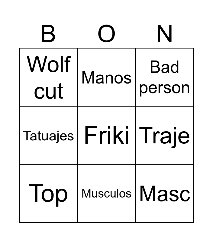 This bingo card has a free space and 8 words: Traje, Bad person, Manos, Top, Wolf cut, Masc, Tatuajes and Musculos.
