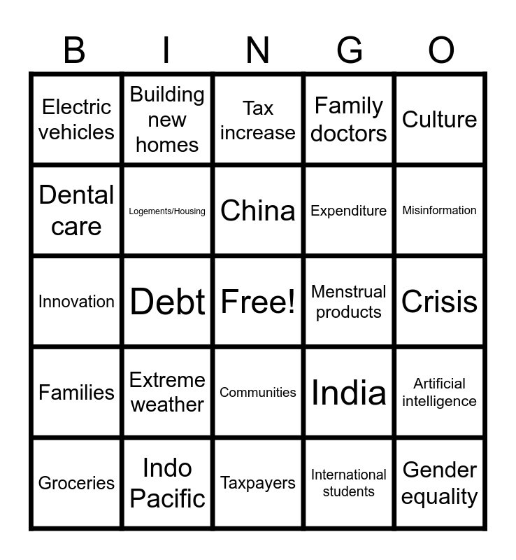 This bingo card has a free space and 66 words: Affordability, Announcement, Arctic sovereignty, Artificial intelligence, Birth control, Budget cut, Building new homes, Child care, China, Climate, Communities, Cost of living, Crisis, Culture, Democracy, Dental care, Debt, Electric vehicles, Emissions, Expenditure, Extreme weather, Families, Family doctors, Family planning, Federally owned buildings, Financial restraint, Food costs, Foreign Interference, Gender equality, Good paying jobs, Groceries, Guns, Hate crimes, Hunger, India, Indo Pacific, Inflation, Innovation, International students, Investment, Logements/Housing, Meal program, Menstrual products, Mental health, Middle class, Military Spending, Misinformation, NATO, Pharmacare, Provinces, Public lands, Rent, School food program, Seniors, Skilled trades, Small business, Social media, Carbon tax, Tax increase, Taxpayers, Team Canada, Ukraine, UNWRA, Value-for-money, Violent crime and Youth.