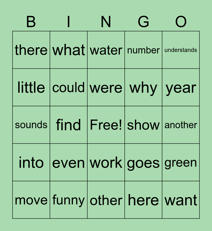 This bingo card has a free space and 24 words: even, funny, were, move, understands, there, little, what, show, work, why, sounds, goes, green, could, here, another, water, year, find, want, into, number and other.