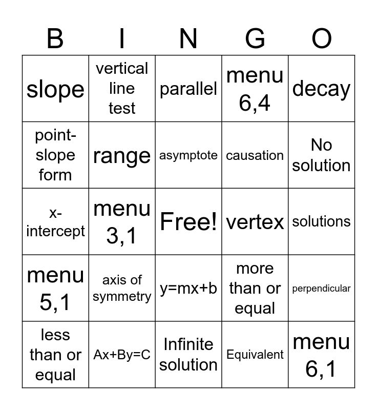 This bingo card has a free space and 40 words: y-intercept, x-intercept, domain, range, Ax+By=C, y=mx+b, asymptote, growth, decay, menu 5,1, menu 3,1, menu 6,4, menu 6,1, solutions, vertex, axis of symmetry, function, slope, rise/run, parallel, perpendicular, Equivalent, causation, point-slope form, factor, initial value, vertical lines, horizontal lines, system of equations, intersection point, less than, less than or equal, more than, more than or equal, No solution, Infinite solution, One solution, varies directly, vertical line test and function notation.