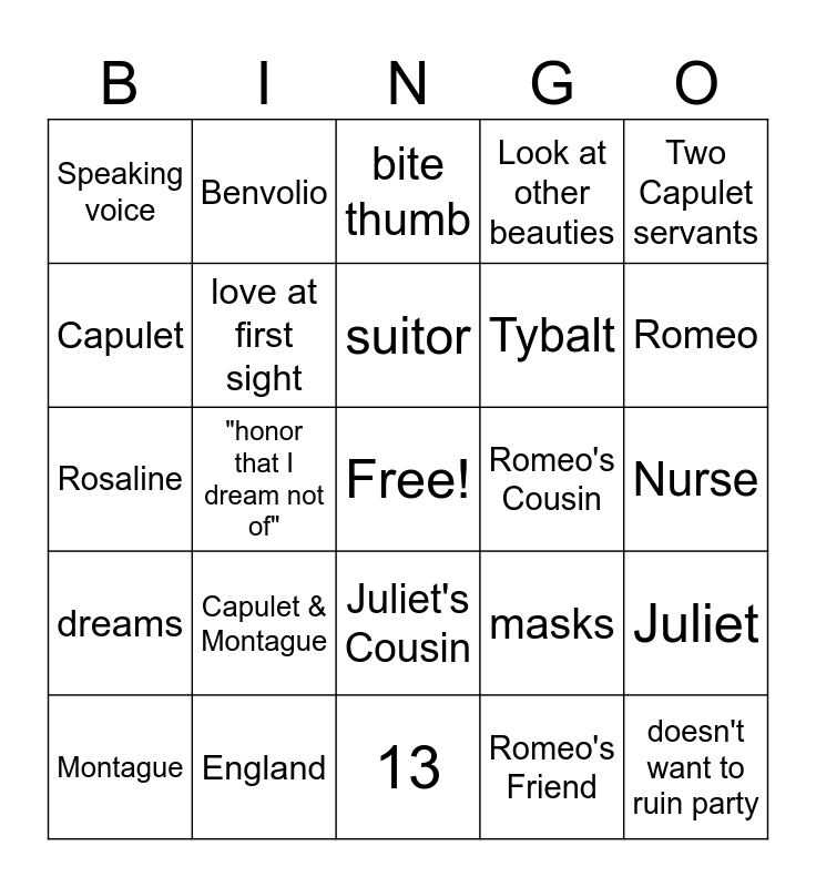 This bingo card has a free space and 24 words: Capulet & Montague, England, suitor, Montague, Two Capulet servants, Speaking voice, Capulet, Benvolio, Romeo's Cousin, Juliet's Cousin, Tybalt, Rosaline, masks, Juliet, love at first sight, Romeo's Friend, Nurse, bite thumb, Romeo, "honor that I dream not of", doesn't want to ruin party, dreams, Look at other beauties and 13.