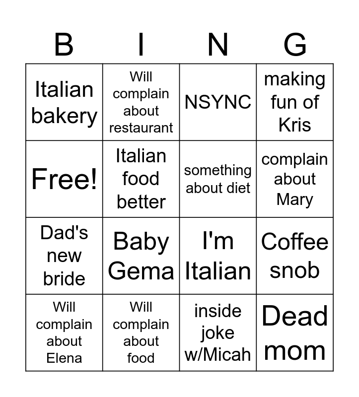 This bingo card has 16 words: Will complain about food, Coffee snob, NSYNC, Italian bakery, Dad's new bride, Will complain about restaurant, I'm Italian, inside joke w/Micah, Free!, Italian food better, Will complain about Elena, making fun of Kris, Baby Gema, complain about Mary, something about diet and Dead mom.