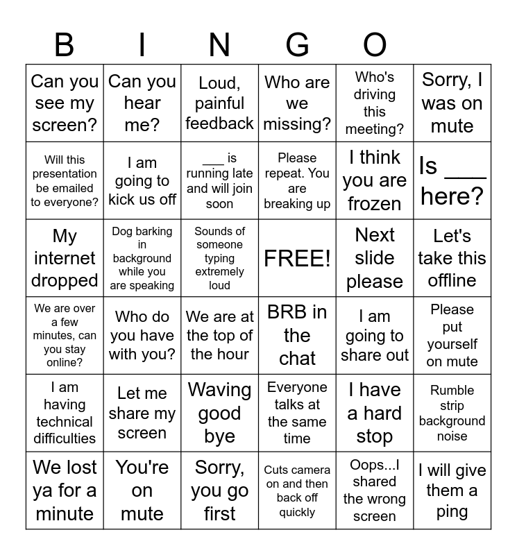 This bingo card has 40 words: We are over a few minutes, can you stay online?, I am going to kick us off, Sorry, you go first, Who are we missing?, I have a hard stop, Please put yourself on mute, Can you see my screen?, You're on mute, Loud, painful feedback, Please repeat. You are breaking up, I am going to share out, Is ___ here?, Will this presentation be emailed to everyone?, Dog barking in background while you are speaking, ___ is running late and will join soon, FREE!, Awkward Silence, Sorry, I was on mute, I am having technical difficulties, Can you hear me?, Sounds of someone typing extremely loud, Everyone talks at the same time, I think you are frozen, Let's take this offline, We lost ya for a minute, Let me share my screen, We are at the top of the hour, Drop it in the chat, Oops...I shared the wrong screen, I will give them a ping, Does that make sense?, Who do you have with you?, Waving good bye, BRB in the chat, Next slide please, Rumble strip background noise, My internet dropped, Cuts camera on and then back off quickly, Who's driving this meeting? and I will give you a few minutes back.