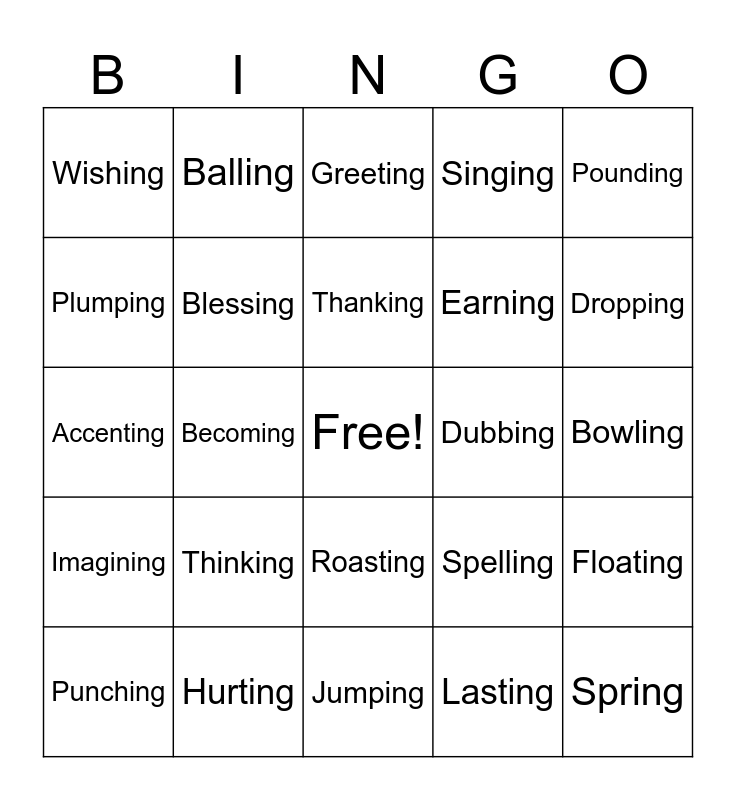 This bingo card has a free space and 24 words: Thinking, Hurting, Thanking, Punching, Pounding, Wishing, Plumping, Balling, Dubbing, Roasting, Earning, Accenting, Spelling, Floating, Blessing, Lasting, Bowling, Greeting, Dropping, Becoming, Spring, Imagining, Singing and Jumping.